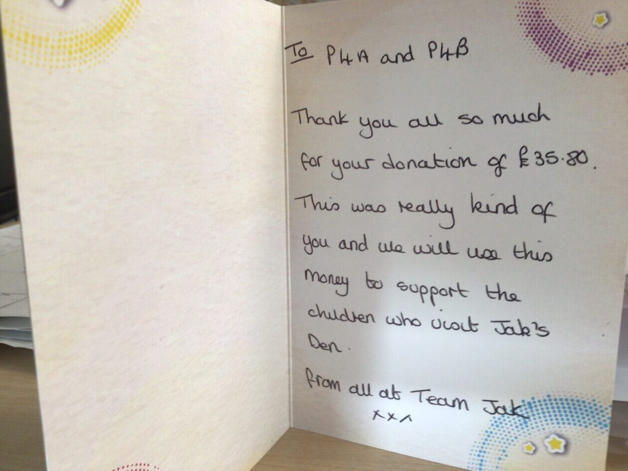 Another lovely acknowledgement for Primary 4’s efforts raising money for a local charity. Jak’s Den offers emotional, social and practical support to children and young people with cancer-related illnesses. They sent us a lovely thank you card and certificate this week – well done again, P4!